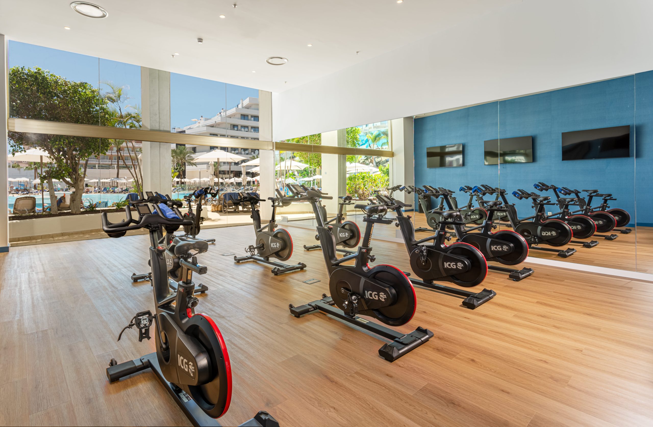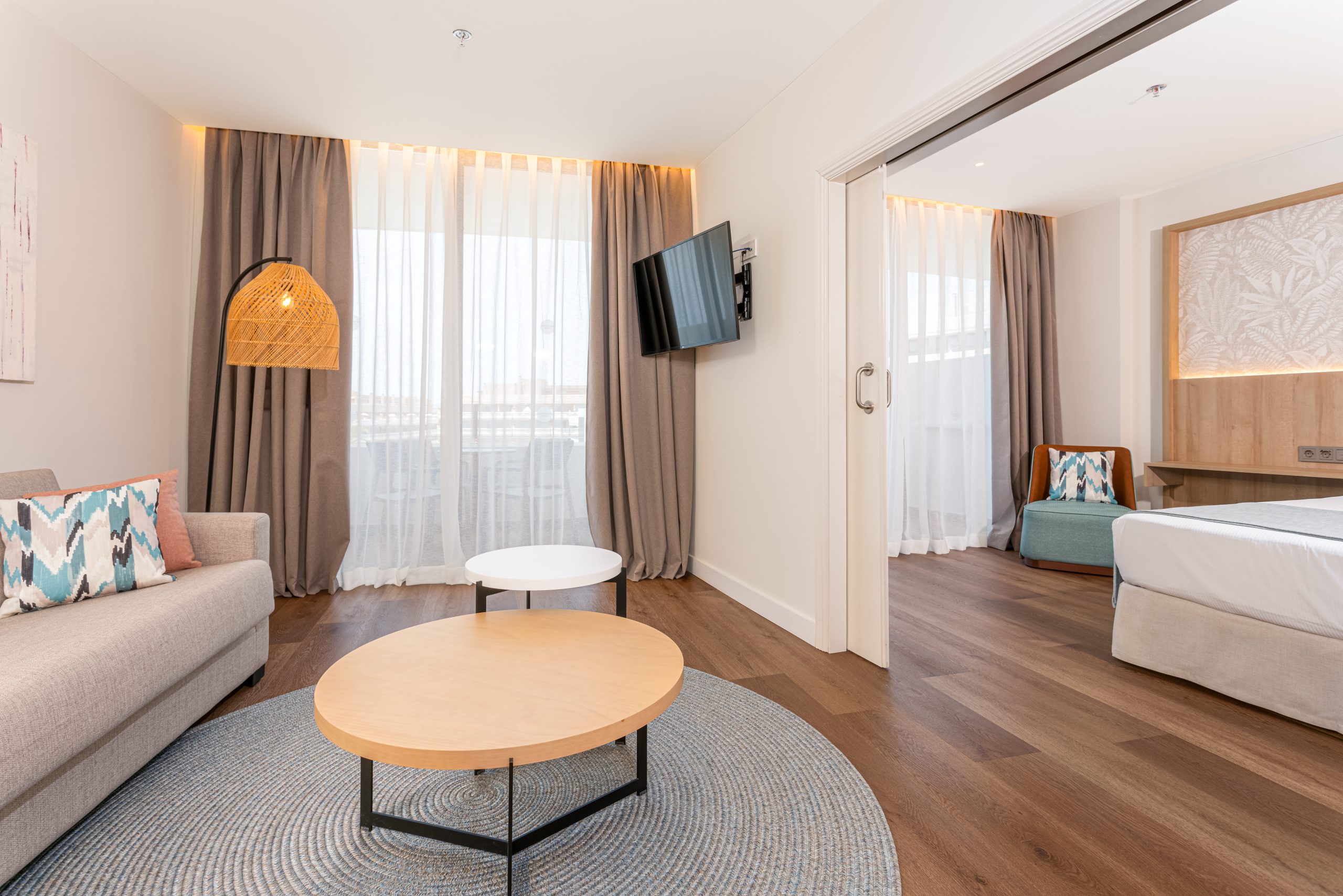 La habitación dispone de: balcón, 2 Smart TV de 55’’, aire acondicionado, ventanas con doble acristalamiento, 2 tumbonas, toallas de piscina, cargador USB, teléfono, minibar, wifi gratuito, caja fuerte y set de té y café.