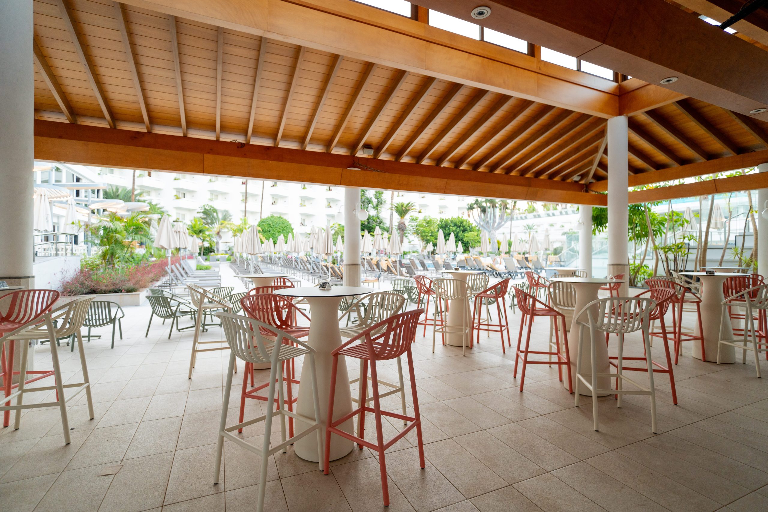Área exclusiva que incluye piscina, bar con zumos y cervezas en auto servicio, y zona chill-out.